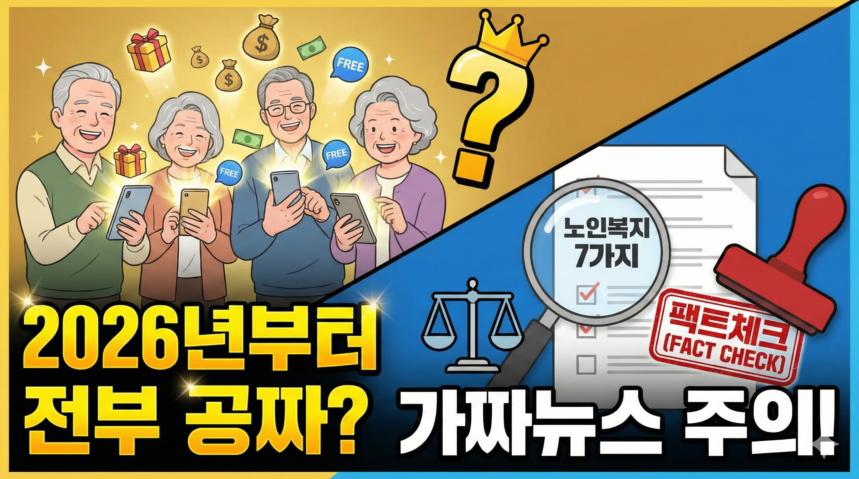 요즘 SNS/유튜브에서 “2026년부터 노인복지가 전부 공짜”라는 식의 영상이 확산되고 있습니다. 하지만 복지 정보는 정확하지 않으면 오히려 혼란을 줍니다. 영상에서 말한 7가지 내용을 사실/부분/오류로 나눠 정리했습니다.