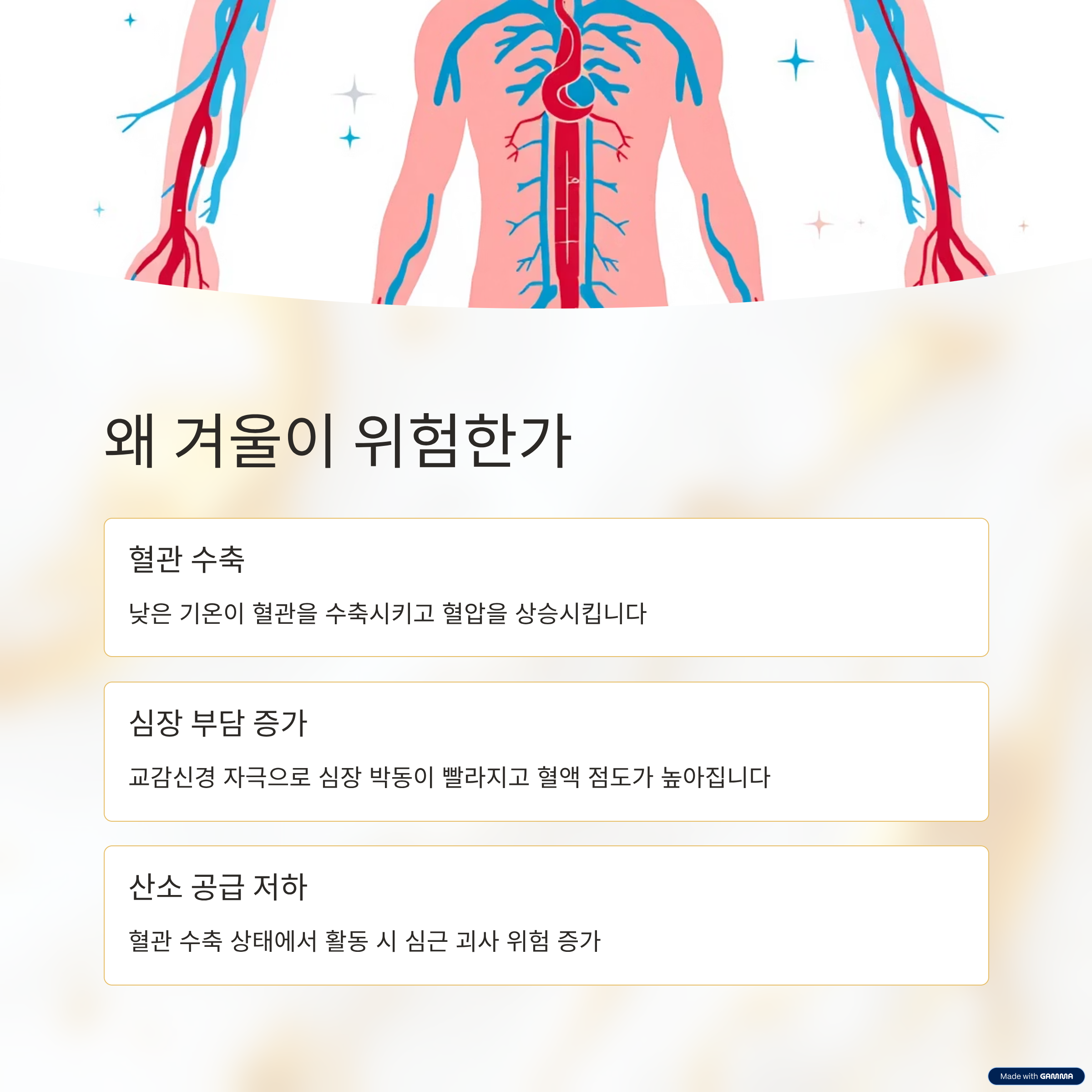 겨울철에는 심근경색 발병률이 다른 계절보다 2배 이상 높게 나타난다는 연구 결과가 있습니다. 낮은 기온은 혈관을 수축시키고 혈압을 상승시키는 원인이 되며, 이는 곧 심장의 부담 증가로 이어집니다. 기온이 급격히 떨어지면 교감신경이 자극되며 심장 박동이 빨라지고 혈액의 점도가 높아지기 때문에 심장마비로 이어질 가능성이 커집니다. 특히 아침 기온이 낮은 시간대에 갑작스러운 활동을 시작하는 것은 심장에 치명적일 수 있습니다. 혈관이 수축된 상태에서 신체를 움직이면 산소 공급이 원활하지 않아 심근이 괴사 되는 심근경색이 발생할 수 있습니다.