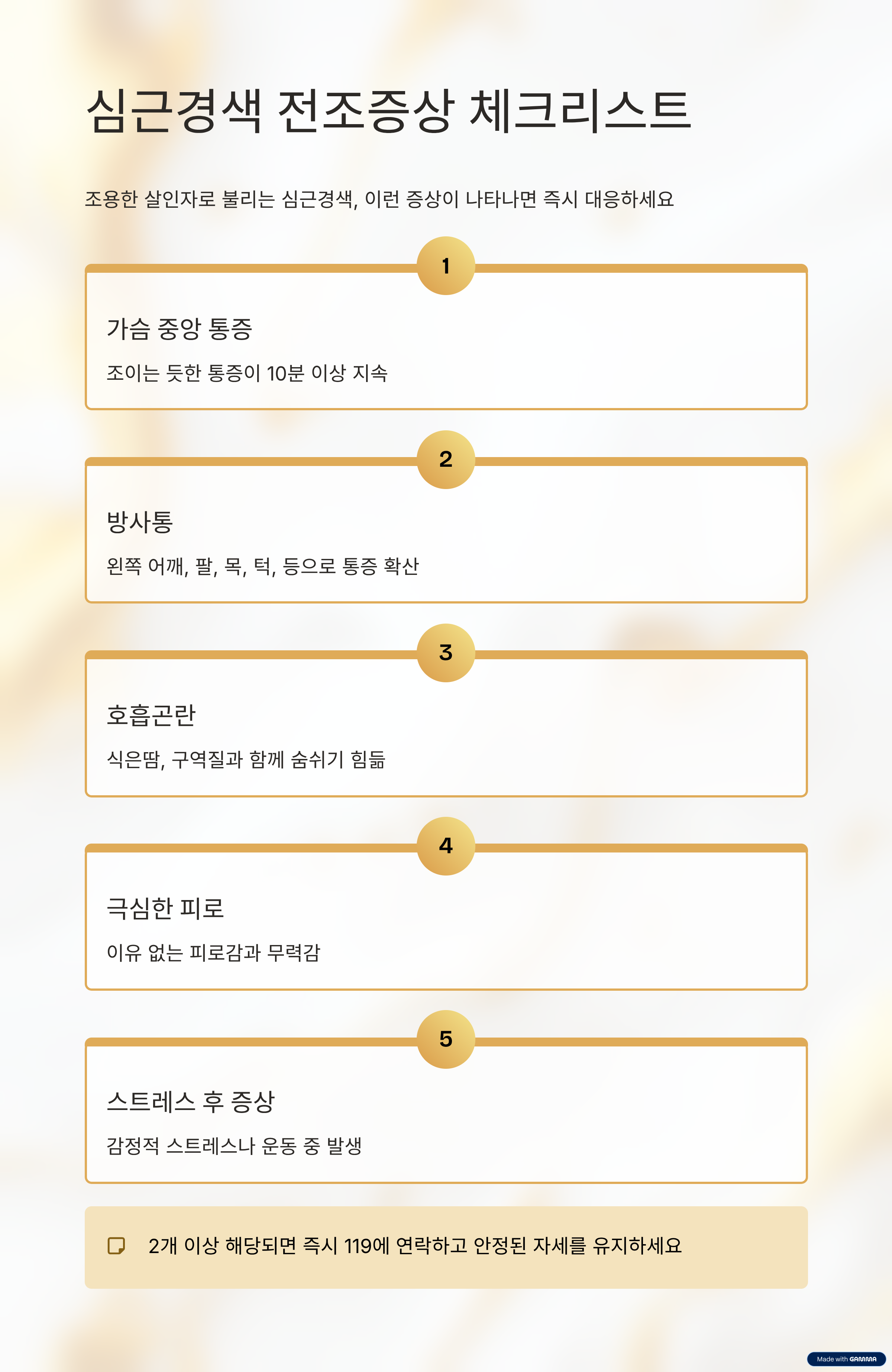심근경색은 종종 '조용한 살인자'로 불릴 만큼 초기 증상이 애매하거나 일상적인 신체 이상과 혼동되기 쉽습니다. 하지만 반복적으로 나타나는 몇 가지 신호를 인지하고 대응한다면 큰 위기를 피할 수 있습니다. 대표적인 증상은 가슴 중앙의 조이는 듯한 통증입니다. 이는 일반적인 흉통과 달리 운동 중 혹은 감정적 스트레스를 받을 때 주로 발생하며, 10분 이상 지속될 수 있습니다.