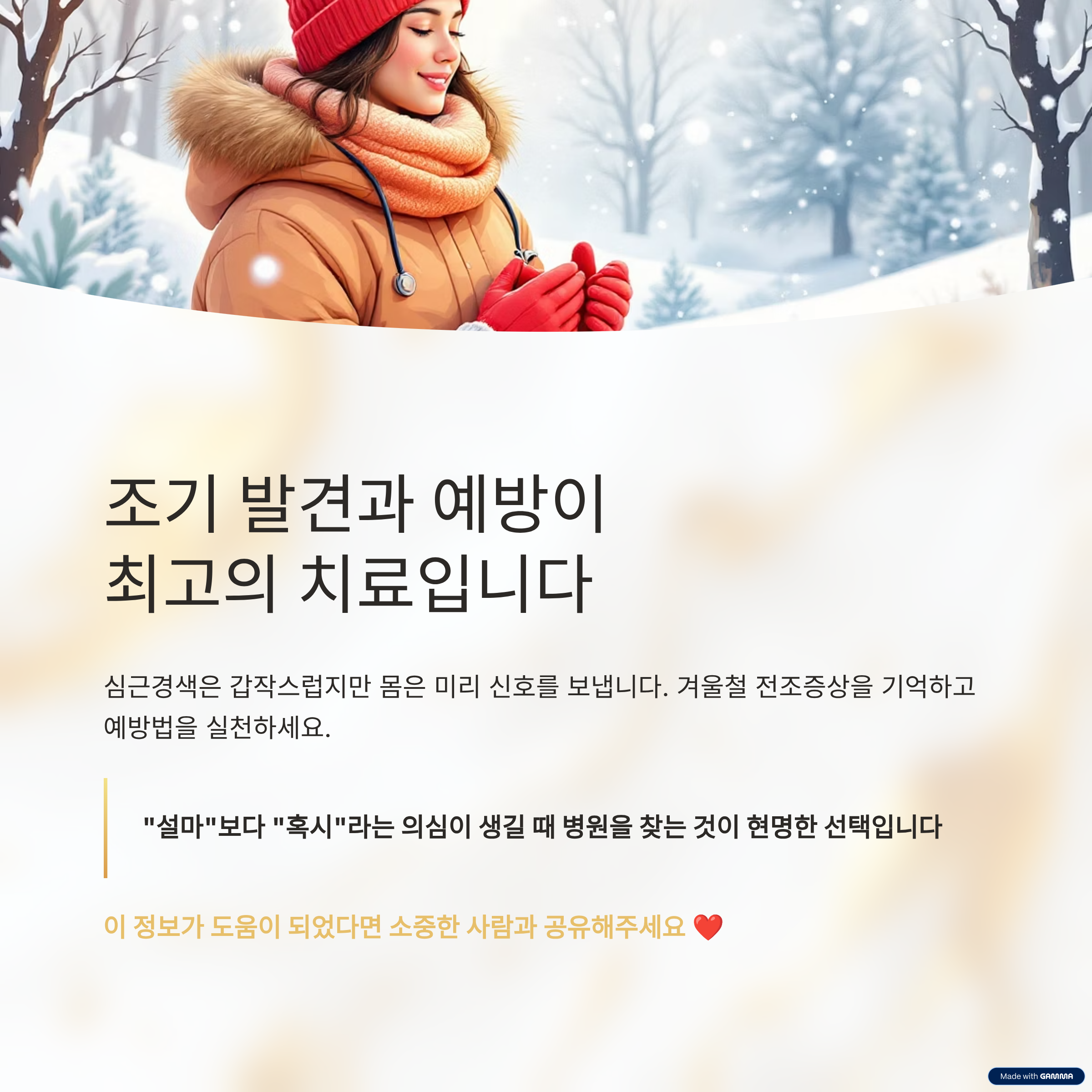 심근경색은 갑작스럽게 찾아오지만, 몸은 그 전조 신호를 미리 보내고 있습니다. 특히 겨울철은 그 위험이 배가되기 때문에 평소보다 한층 더 건강에 주의를 기울여야 합니다. 오늘 소개한 전조증상과 예방법을 기억하고 일상 속에서 실천한다면, 심장 건강을 지키는 데 큰 도움이 될 것입니다. 무엇보다 "조기 발견과 예방"이 최고의 치료입니다.