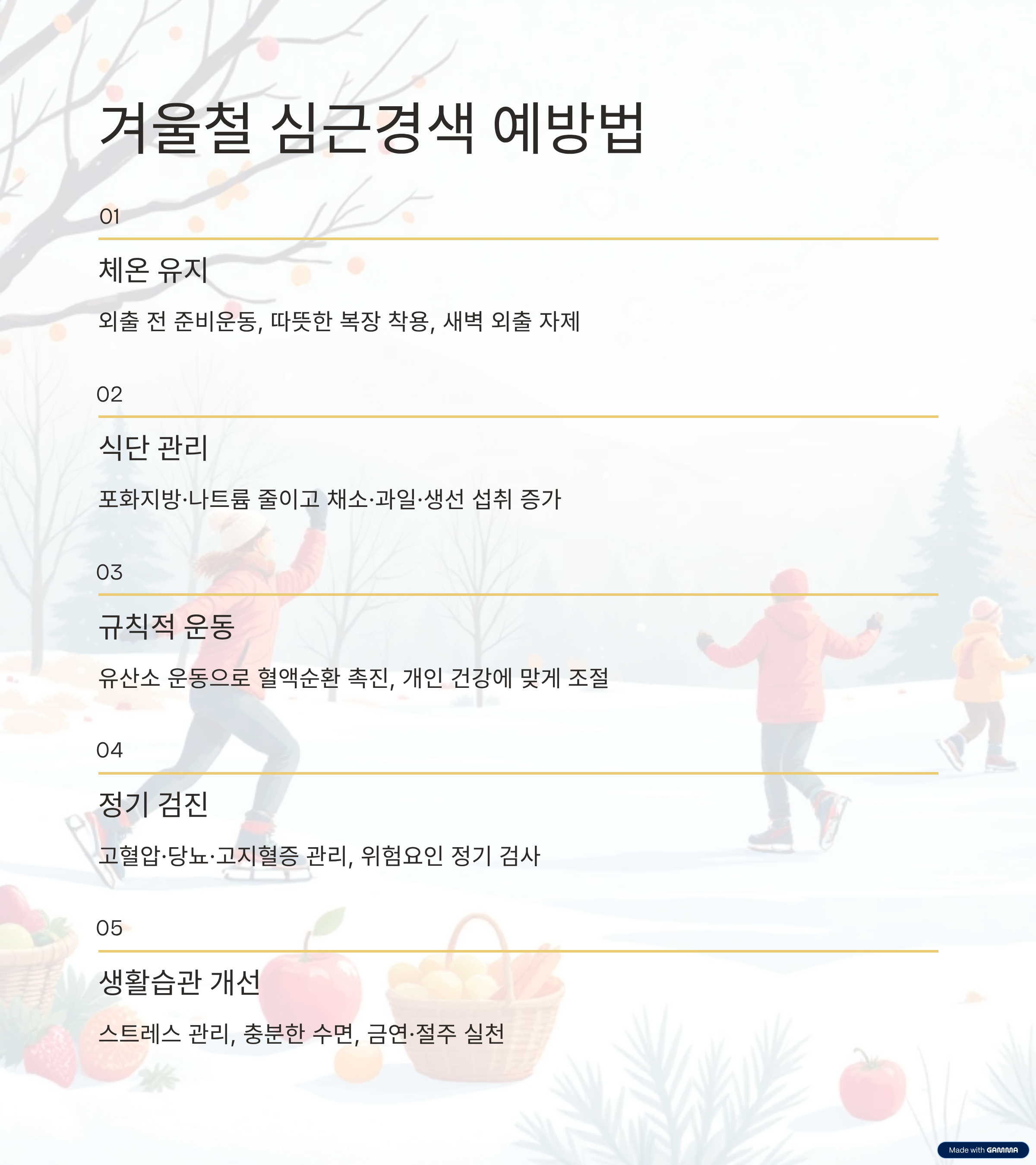 심근경색은 예방이 가능한 질환입니다. 특히 겨울철에는 체온 유지와 혈압 관리가 핵심입니다. 외출 전에는 반드시 준비 운동을 하고, 따뜻한 복장으로 체온 저하를 방지해야 합니다. 기온이 가장 낮은 새벽 시간대의 외출은 피하고, 식사 직후 또는 과음 후 바로 외출하는 것도 삼가야 합니다.