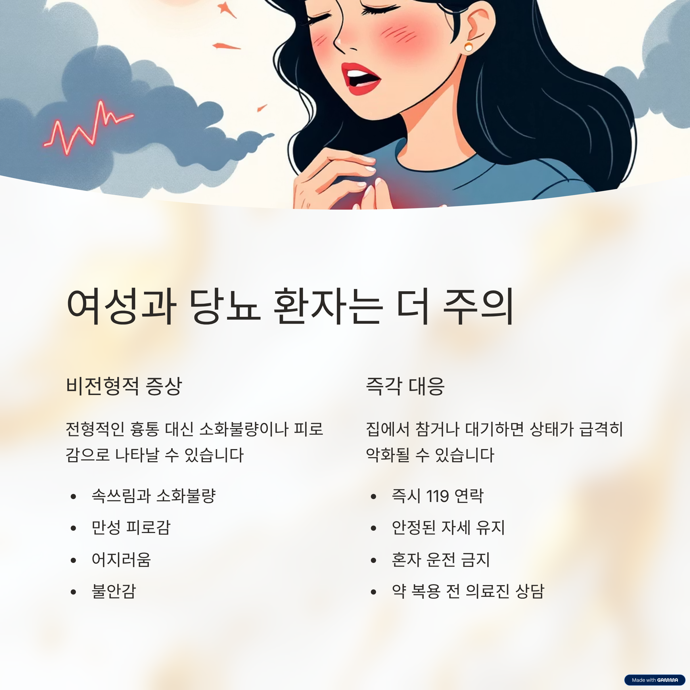 또한 왼쪽 어깨, 팔, 목, 턱, 등의 통증이 함께 발생할 수 있으며, 이유 없는 피로감, 식은땀, 구역질, 호흡곤란이 동반되면 반드시 심장 관련 검사를 받아야 합니다. 특히 여성이나 당뇨 환자는 전형적인 흉통보다는 소화불량이나 피로감 등의 비전형적인 증상으로 나타나므로 더 주의가 필요합니다. 심근경색이 의심된다면 즉시 119에 연락하고 안정된 자세를 유지해야 합니다. 집에서 참거나 대기하는 시간 동안 상태가 급격히 악화될 수 있기 때문입니다.