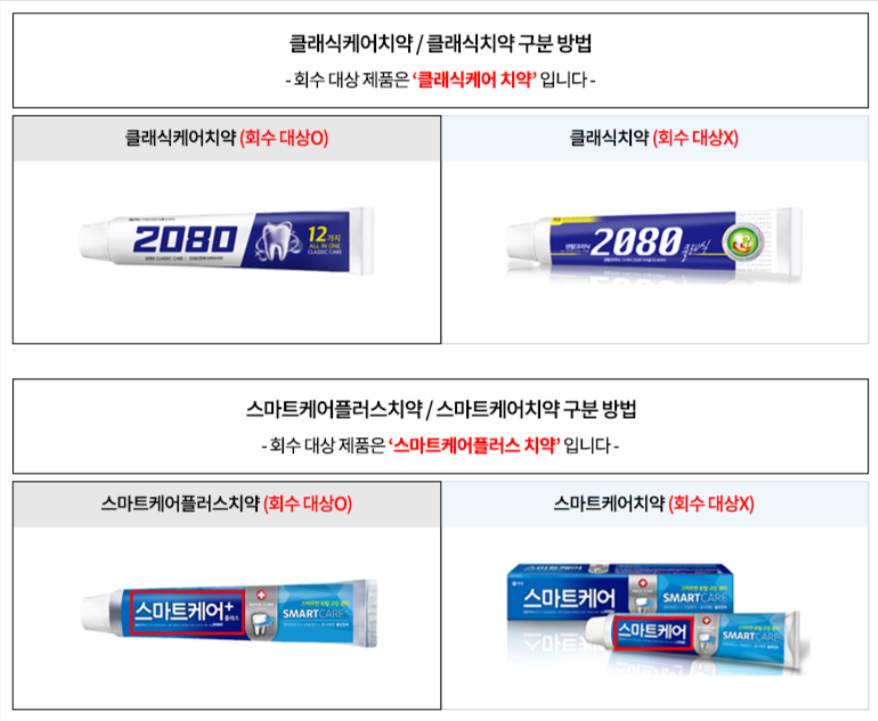 - "스마트케어플러스치약"(" 스마트케어치약"은 회수 대상 아님)