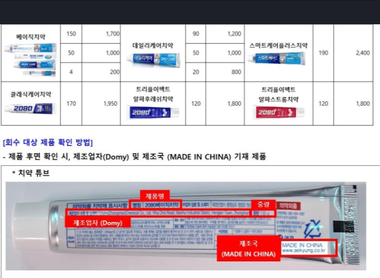 모든 2080 치약이 대상은 아닙니다. 중국에서 OEM 방식으로 제조된 특정 수입 제품 6종만 해당됩니다. 아래 표를 통해 본인이 사용하는 제품이 포함되어 있는지 확인해 보세요.