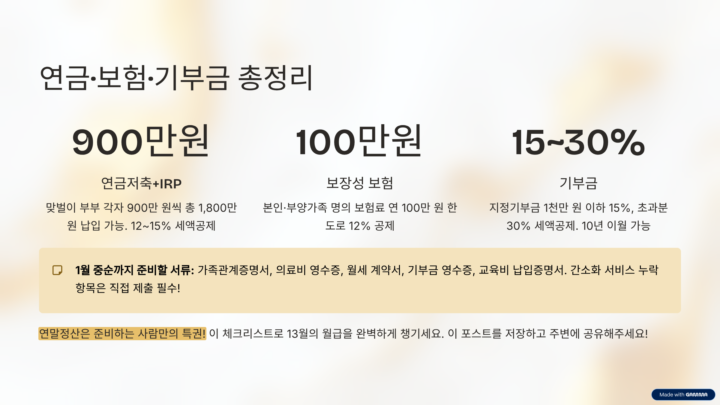 특히 맞벌이 부부의 경우 부부간 전략적인 공제 배분이 중요하며, 연금저축이나 IRP 같은 절세 상품을 적극 활용하면 당장의 세금 환급뿐 아니라 노후 준비까지 할 수 있습니다.